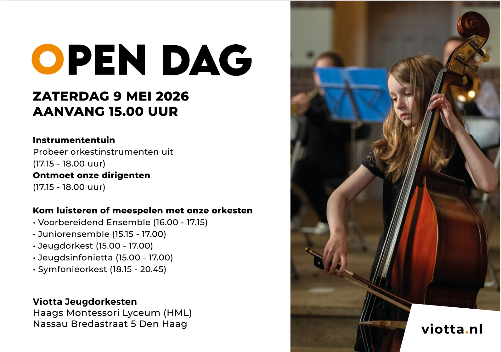 Op zaterdag 9 mei 2026 organiseren wij een open dag vanaf 15.00 uur op het Haags Montessori Lyceum (Nassau Bredastraat 5, Den Haag).